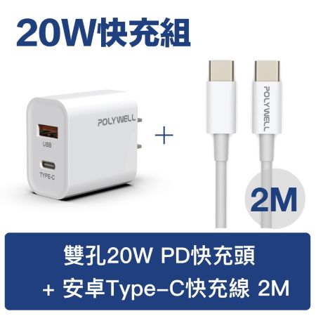 POLYWELL 20W PD雙孔快充組 20W雙孔快充頭+USB-C快充線 2M 適用安卓QC3.0 寶利威爾 台灣現貨